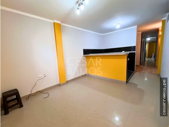 Cuenta con sala comedor con ventanal amplio que le da iluminación y ventilación natural, la sala conecta con una cocina americana con mesada de cerámica, cuenta con 01 baño de visitas, lavandería interna y dos habitaciones (la principal con baño propio).